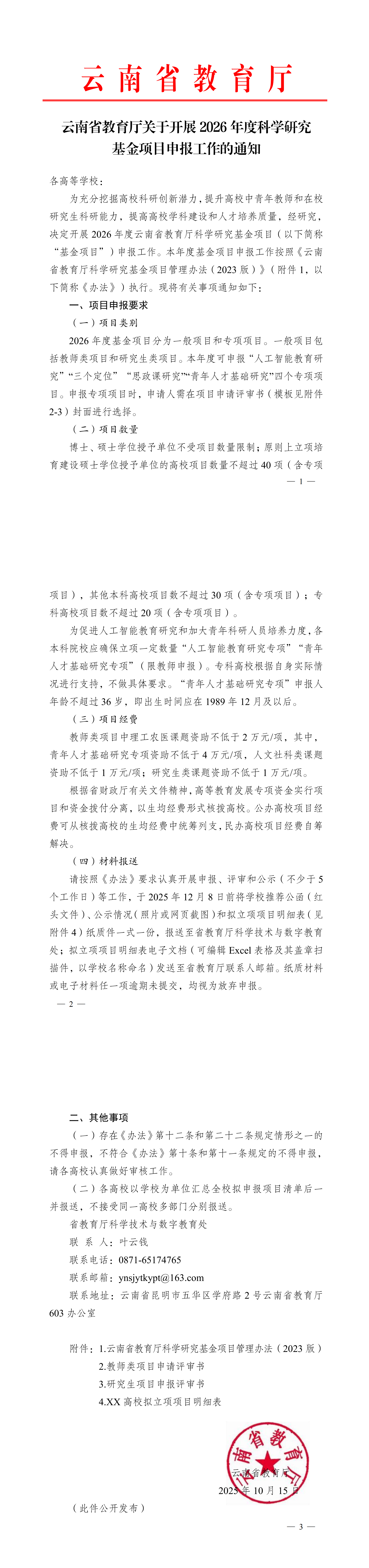 关于开展2026年度云南省教育厅科学研究基金项目申报工作的通知